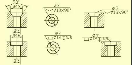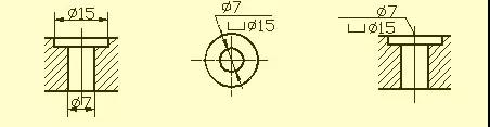 用鉆頭鉆出的盲孔,在底部有一個(gè)120°的錐角,鉆孔深度指的是圓柱部分的深度,不包括錐坑。在階梯形鉆孔的過(guò)渡處,也存在錐角120°圓臺(tái),其畫法及尺寸注法。