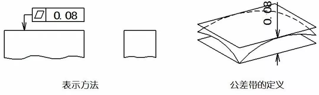 示例:公差帶是位于距離0.08mm的兩個(gè)平行平面之間的區(qū)域。